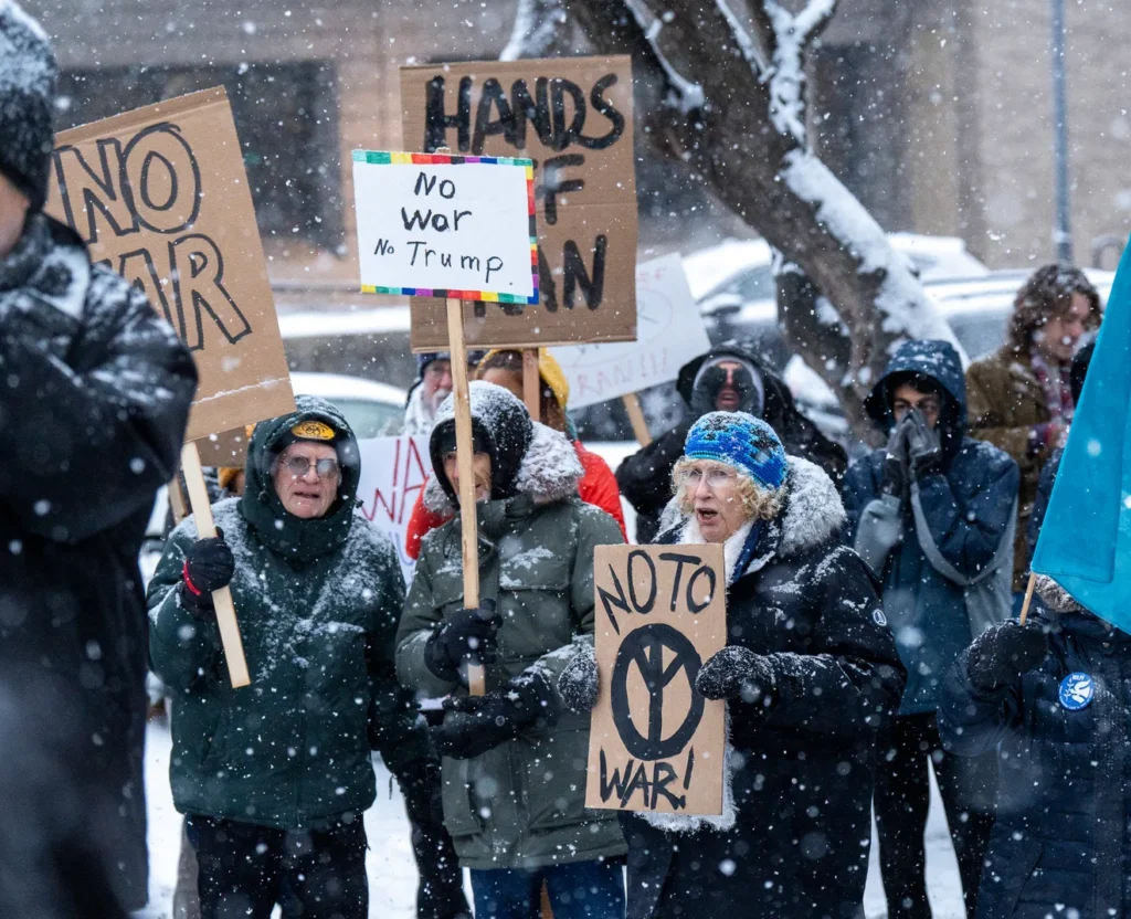 Despite cold temperatures and falling snow, attendees huddled around the gazebo, holding signs and chanting calls for peace, an end to what they described as aggression, and a redirection of resources to U.S. domestic priorities like education and healthcare.