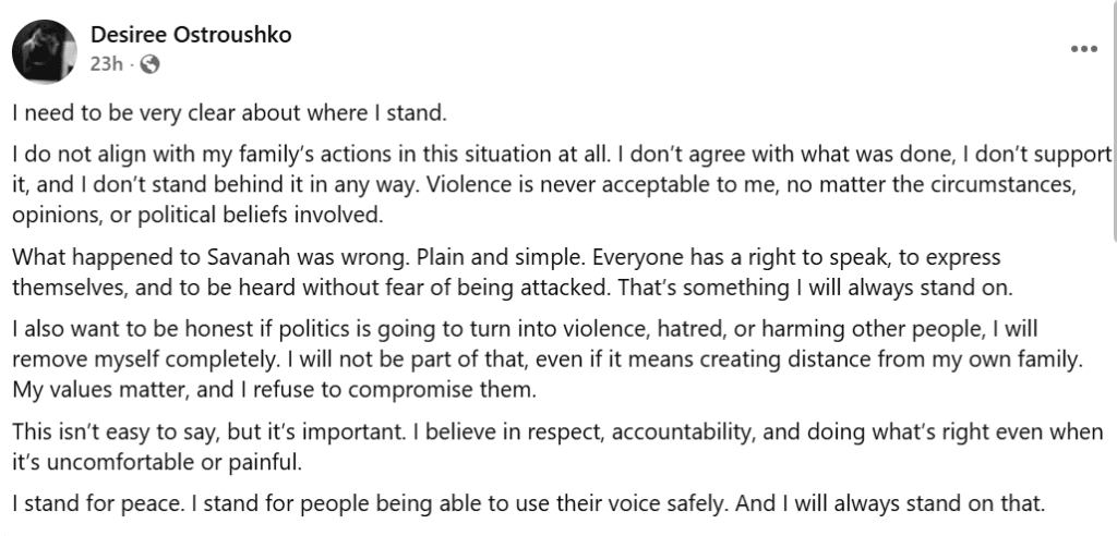 “I do not align with my family’s actions in this situation at all. I don’t agree with what was done, I don’t support it, and I don’t stand behind it in any way. Violence is never acceptable to me, no matter the circumstances, opinions, or political beliefs involved. What happened to Savanah was wrong. Plain and simple. Everyone has a right to speak, to express themselves, and to be heard without fear of being attacked. That’s something I will always stand on.”