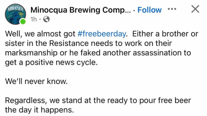 “Well, we almost got #freebeerday,” Bangstad posted. “Either a brother or sister in the Resistance needs to work on their marksmanship or he faked another assassination to get a positive news cycle. We’ll never know. Regardless, we stand at the ready to pour free beer the day it happens.”