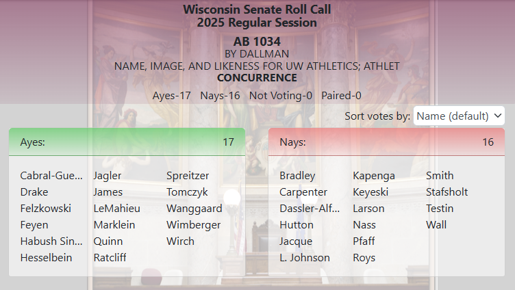 The Wisconsin Senate passed a bill Tuesday that would provide $14.6 million annually in state funding to the University of Wisconsin-Madison athletics department, freeing up equivalent athletic revenues to support name, image, and likeness compensation for student-athletes.